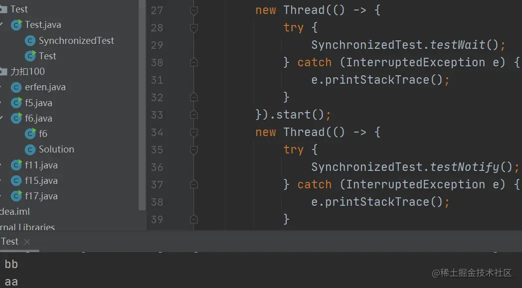// 阻塞住,被唤醒之前不会输出aa,也就是还没离开synchronized