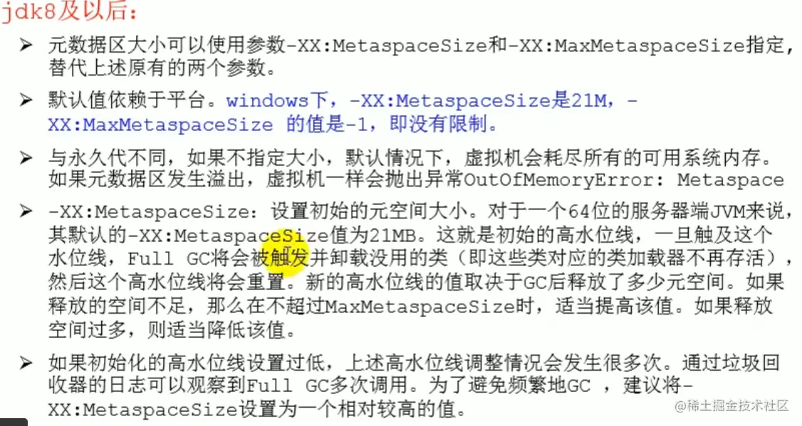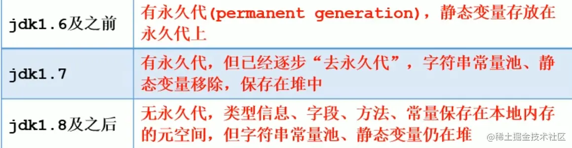 在JDK7的HotSpot,已经把放在永久代的字符串常量池(保证创建的大量字符串能及时被回收),静态变量等移到堆中。在JDK8时,废弃永久代的概念,用在本地内存中实现的元空间来替代,把JDK7中永久代还剩余的内容(主要是类型信息)全部移到元空间中。