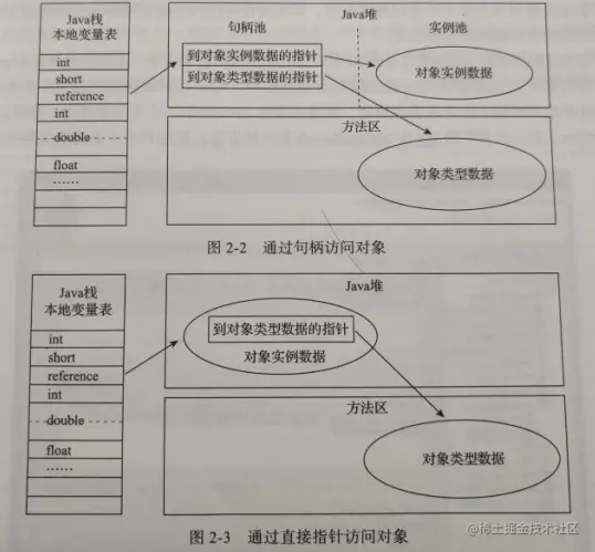 Java程序通过栈上的reference数据操作堆上的对象,目前主流访问方式有句柄和直接指针。