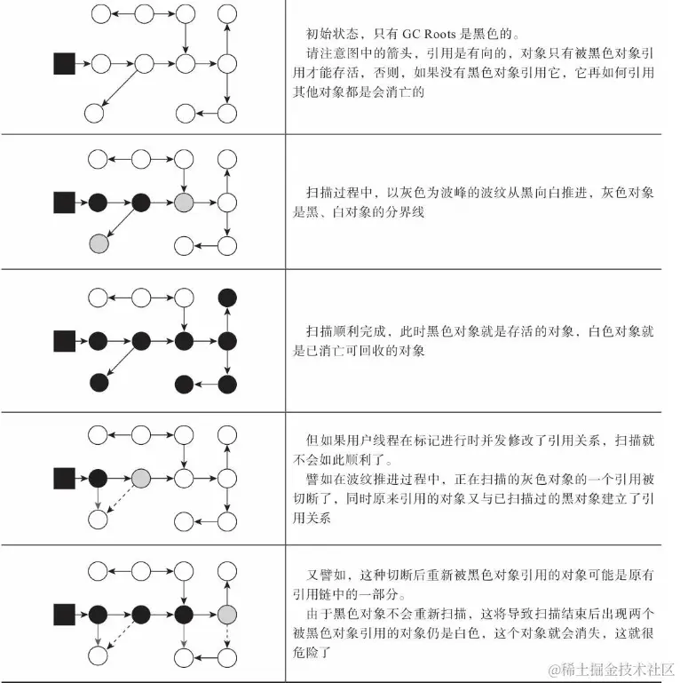 象不可能直接(不经过灰色对象)指向某个白色对象。