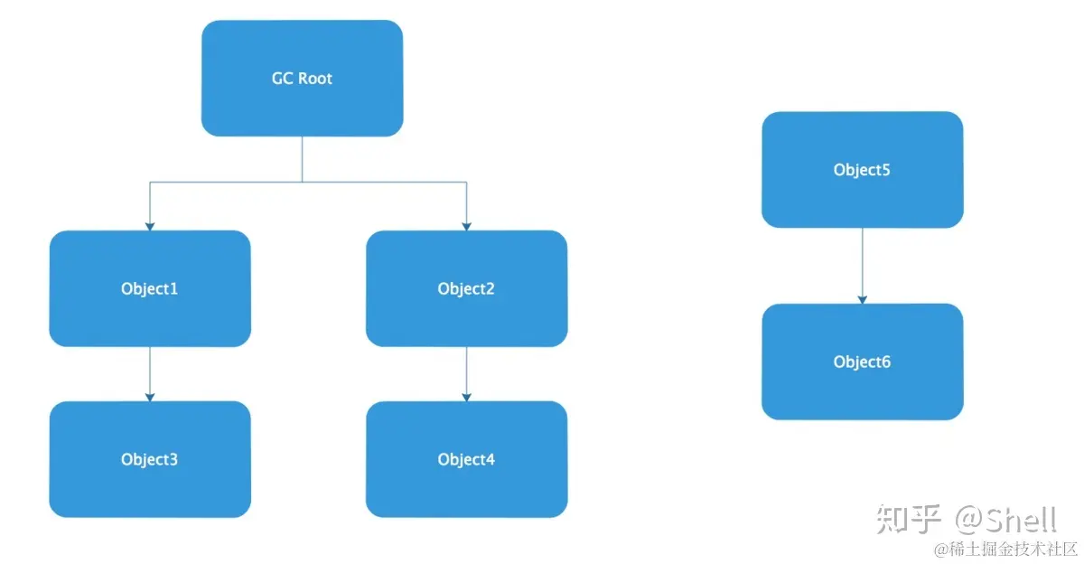 通过一些被称为(GC Roots)的根对象作为起点集,从这些节点通过引用关系向下搜索,搜索走过的路径被称为引用链(Reference Chain),当一个对象到GC Roots没有任何引用链相连时(即从GC Roots节点到该节点不可达),则证明该对象是不可用的。
