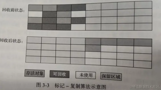 将内存分为大小相同的两块,每次只使用其中的一块,当这一块的内存使用完了,就将还存活的对象复制到另一块上,再将已使用过的一次性清理掉