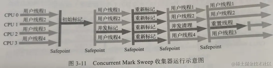 以获得最短回收停顿时间为目标的收集器。基于标记-清除算法。