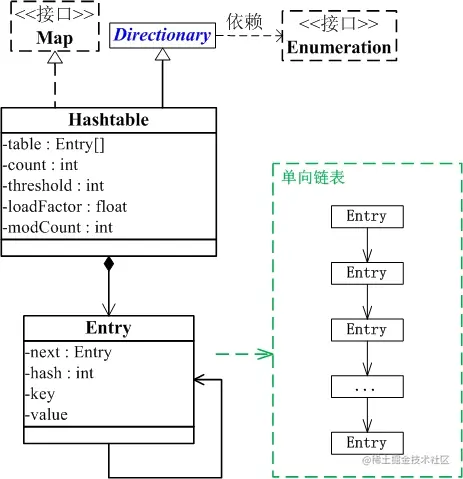 HashTable<K,V>也是一种key-value结构,它继承自Dictionary<K,V>,实现了Map<K,V>和Cloneable以及Serializable接口。