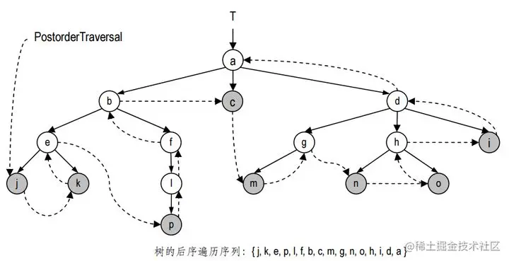 对称地,对任一(子)树的后序遍历将首先递归地对根节点下的各棵子树进行后序遍历,最后才访问根节点。由后序遍历生成的节点序列,称作后序遍历序列。