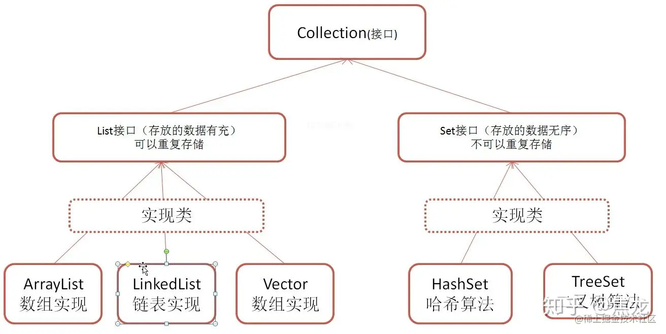 - Collection 接口:Collection接口是所有集合类的根节点,Collection表示一种规则,所有实现了Collection接口的类遵循这种规则