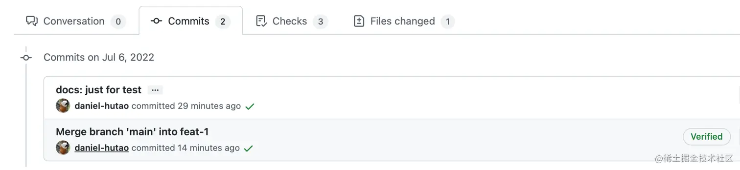这时候我们再回到 GitHub 看 PR 的话,可以发现冲突已经解决了,并且没有产生多余的 commit 记录,也就是说这个 PR 的 commit 记录非常干净,好似冲突从来没有出现过: