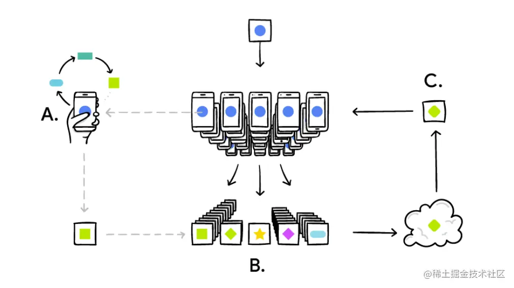 所以针对于此研发人员设计了一种新的模式,即让训练数据分布在移动设备上,并通过聚集本地计算的更新来学习共享模型。我们将这种模式称为联邦学习。