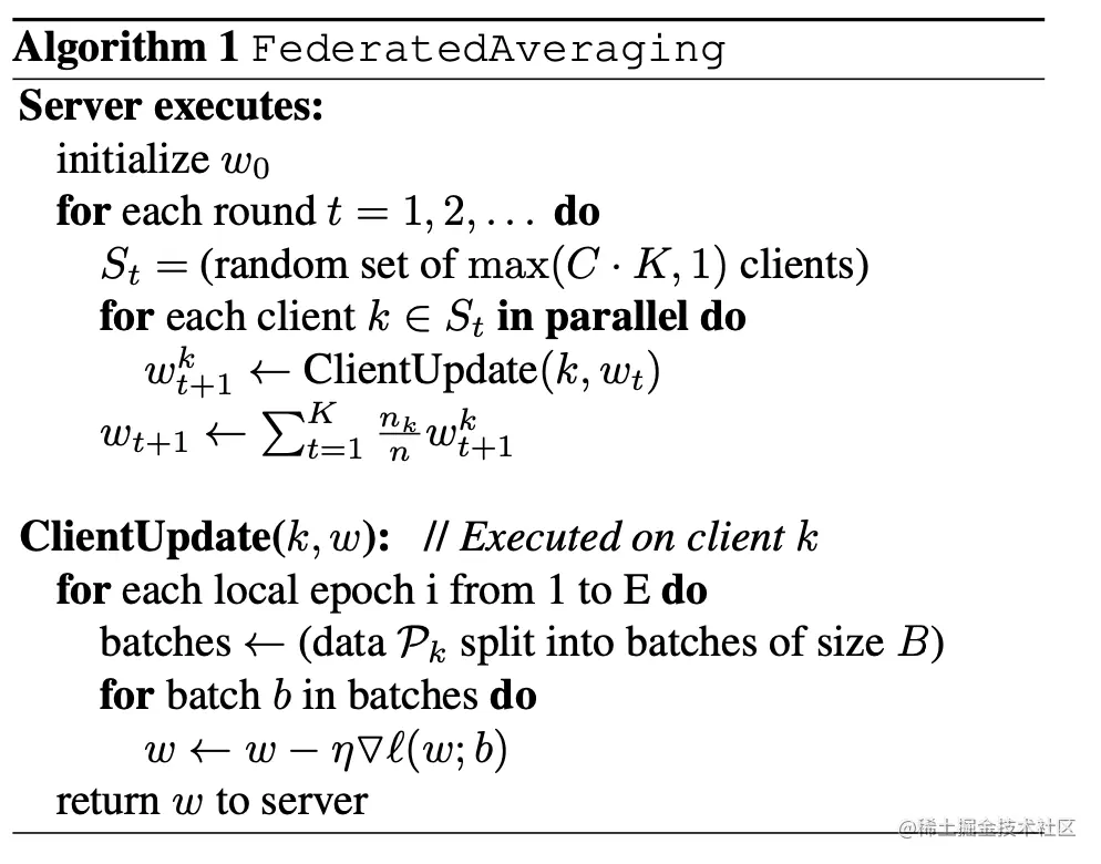 上面描述算法可以理解为一个端点的简单的一次平均,其中每个客户求解最小化其局部数据损失的模型,并对这些模型进行聚合以产生最终的全局模型。这种方法在带有IID数据的凸情况下得到了广泛的研究,众所周知,在最坏情况下,产生的全局模型并不比在单个客户端上训练模型更好,所以我们需要针对联邦学习研究一种新的模型更新方法。