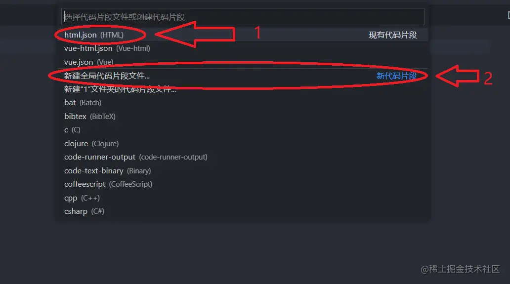 - 然后搜索输入html,找到html.json(HTml),找这个文件的时候主要看括号里的内容,因为我记得,是配置完后它才变成json后缀的,总之看到差不多的就点开,后文有打开后的图片,以判断是否打开正确,图中箭头2,是可以自己创建新的json文件,在其中定义快捷键,点击后会让你输入创建的文件名,剩下的步骤都一样,下文以html.json为例。
