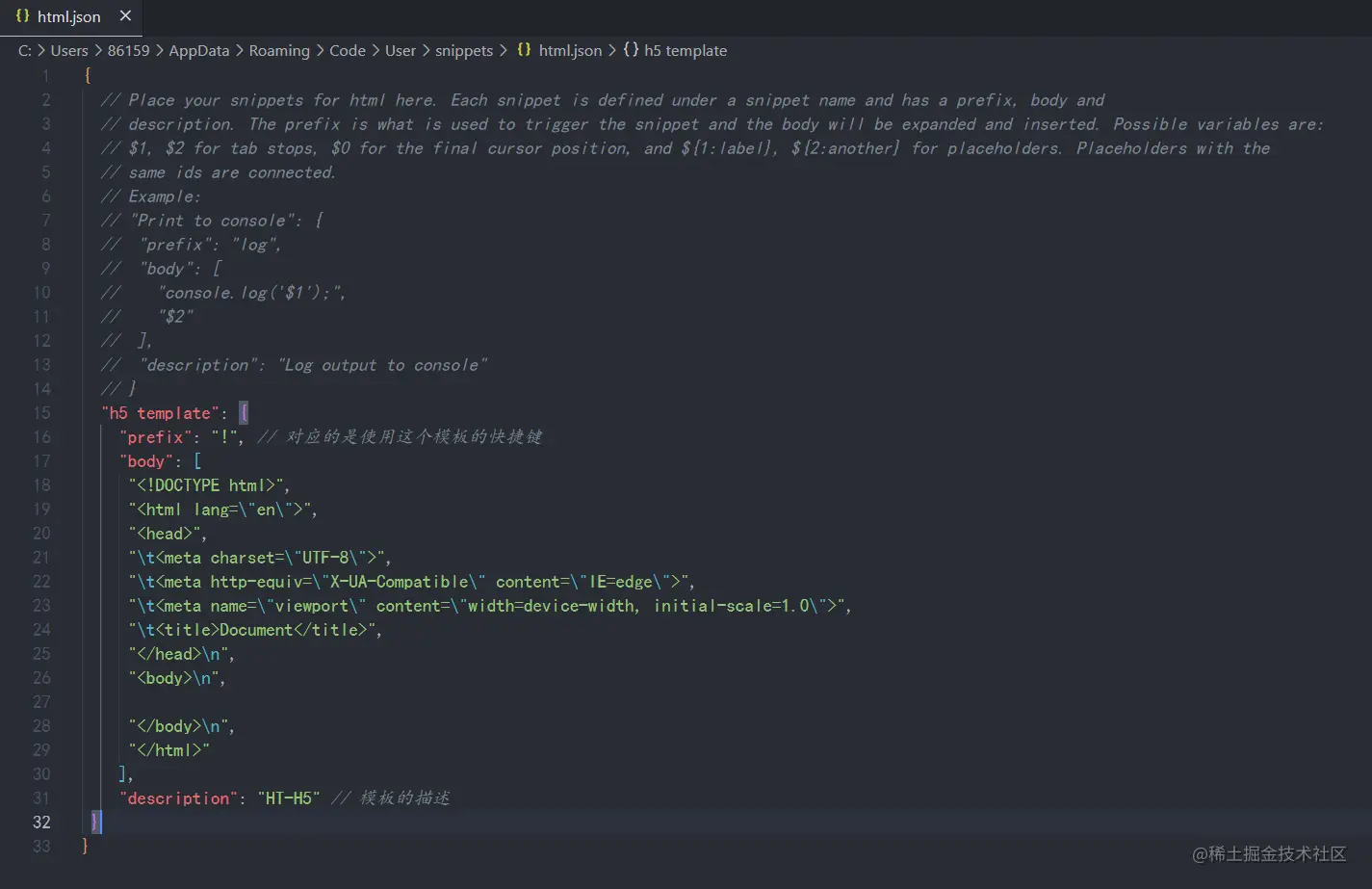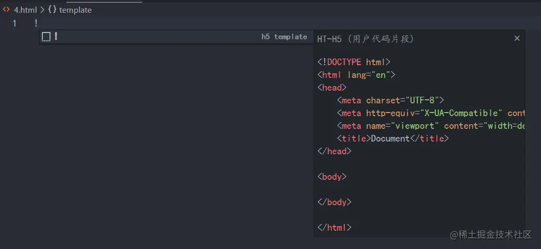 "prefix": "!", // 对应的是使用这个模板的快捷键,这里定义的是!,大家自己可以随意定义,
