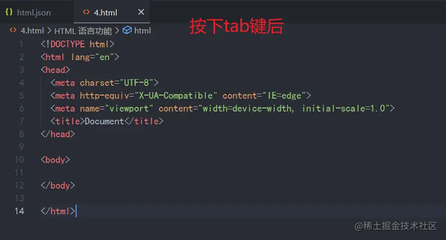 做完这些调整,稳妥起见ctrl+s保存一下,再去html上,用你定义的快捷键,上述代码快捷键是!,故!+tab,就能生成你定义好的html模板了