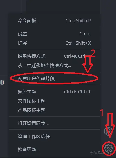 - 首先打开vscode,然后找到左下方的齿轮(下图由于我个人的vscode调整了设置,所以是在右侧,默认是左侧),点击配置用户代码片段