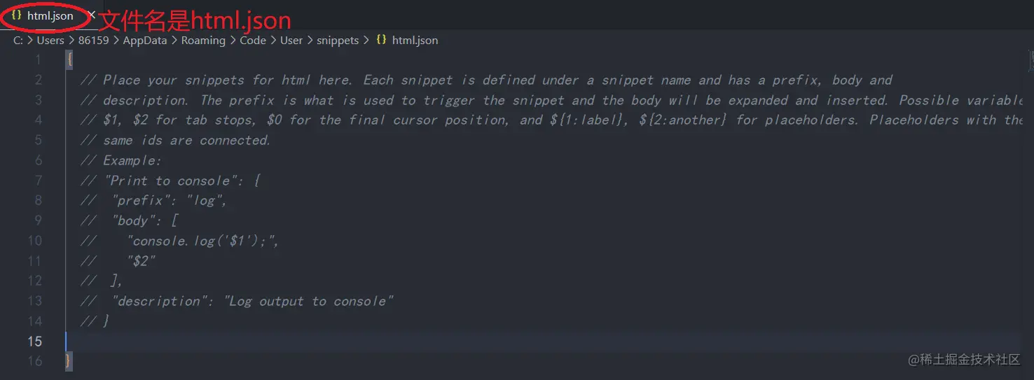 "body": [//body里面就是按下tab键后生成的内容,可以根据自己的需求更改
