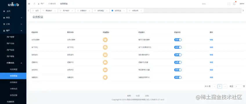 付费会员最大的吸引力就是平台特权,CRMEB 单商户标准版的付费会员模块将会员类型分为试用、月卡、季卡、年卡、永久五种,并设置了会员优惠券、线下折扣、签到返利、运费折扣、会员折扣、消费返利六种会员权益,将会员特权的大小分别与会员类型绑定,即可一步步的引导用户购买付费会员。
