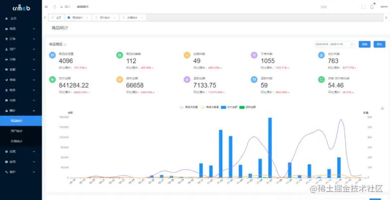 大数据时代,数据即价值。商城系统的数据统计分析尤其重要,对提升用户体验,优化业务流程 ,运营推广指导,了解目标用户等都有非常关键的数据支撑。CRMEB 单商户标准版新增统计模块,从商品、用户、交易三个维度对商城数据做了非常详尽的数据分析与展示。