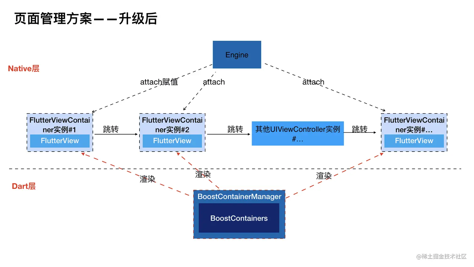 本次最核心的变化就是页面管理方案升级。新版(0.1.5 - 1.x.x)不再维护单一的FlutterViewController(或FlutterView),而是和原生一样每次有新页面请求时就直接打开新的ViewController或者FlutterView,和管理原生的页面一样。自然也不需要像老版本那样通过实现截图功能来记录上个页面的显示内容。