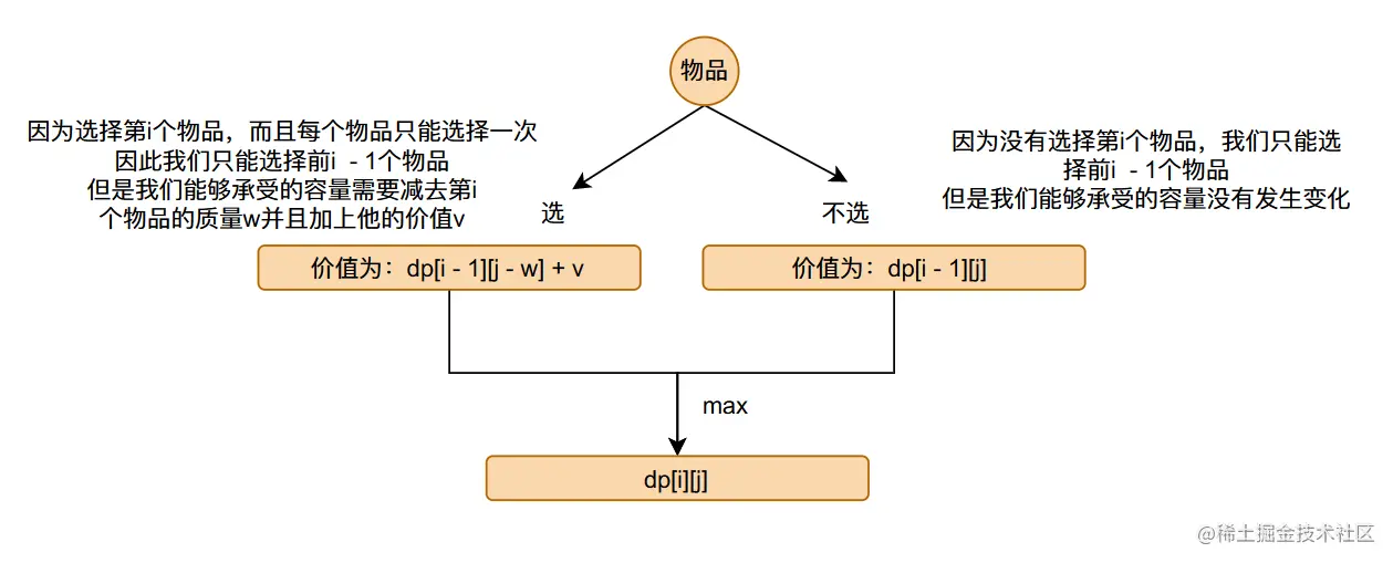 我们已经得到了我们的动态转移公式dp[i][j] = max(dp[i - 1][j - w] + v, dp[i - 1][j]),我们现在了来好好分析这个公式:
