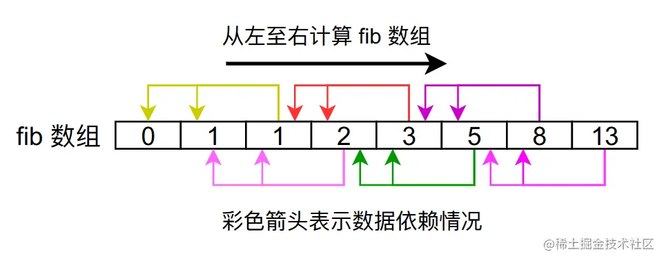 我们知道绿色框依赖它前面的两个数据,因此我们在计算fib[i]的时候,需要提前将前面两个它依赖的数据计算好,因此我们可以从左至右计算fib数组,这样的话我们在计算第n个fib数的时候前面n - 1个fib数已经计算好了。