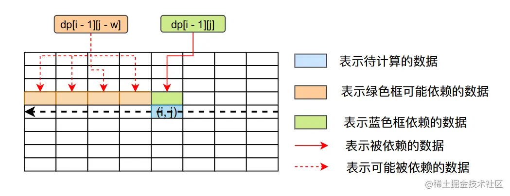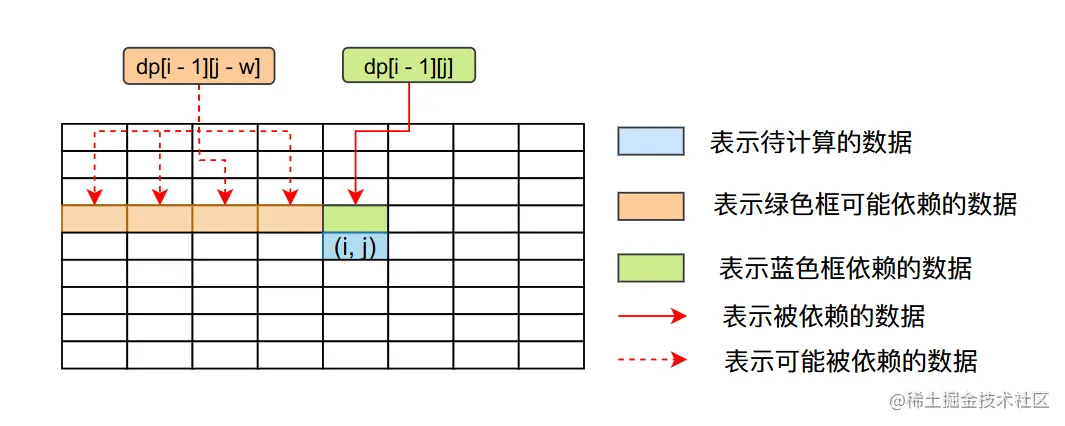 我们可以很清楚的看到要想求解dp[i][j]的值,我们首先需要知道dp[i - 1][j - w]和dp[i - 1][j]的值,他们之间的依赖关系可以用下图来表示。