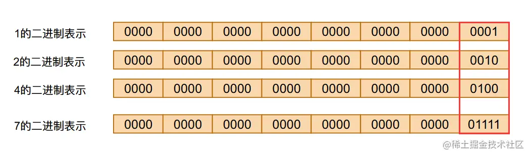 我们知道一个数据用二进制表示只有某些位置为0,某些位置为1,那么一个整数一定可以用若干个整数相加得到,而且这些整数满足2的整数次幂,比如下图中的7 = 1 + 2 + 4: