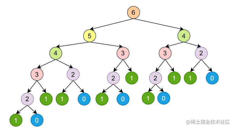 我们在调用fibonacci(6)的时候他会调用:[fibonacci(5)和fibonacci(4)],然后fibonacci(5)会调用[fibonacci(4)和fibonacci(3)],fibonacci(4)会调用[fibonacci(3)和fibonacci(2)]......