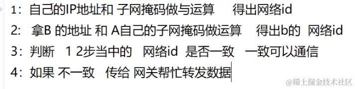 用自已的子网掩码分别和自已的IP及对方的IP相与,比 较结果,相同则同一网络,不同则不同网段