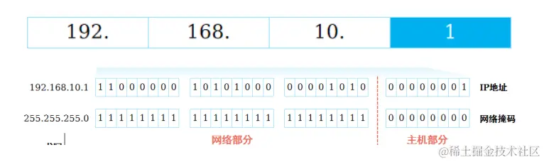 网络部分:用来标识一个网络。代表IP地址所属网络, 处于高位