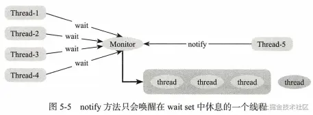 wait:表示线程一直等待,直到其他线程通知,与sleep不同的是它会释放锁;调用wait会加入wait set中,notify会随机唤醒一个,notifyAll会弹出所有线程;