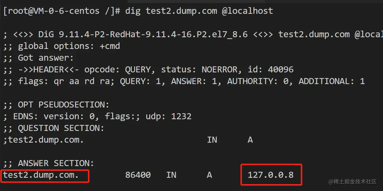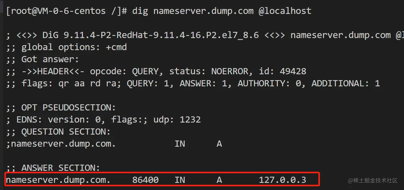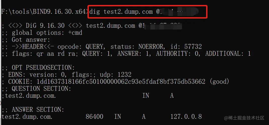 ok,已经运行起来了,此时可以用dig命令来进行测试: