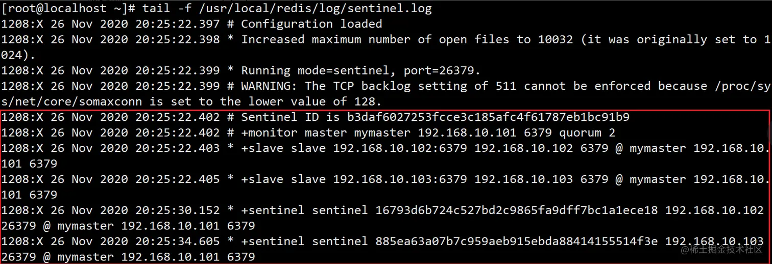 tail -f /usr/local/redis/log/sentinel.log