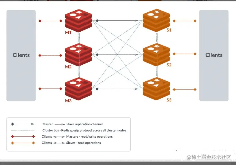 因为最小的 Redis 集群,需要至少 3 个主节点,既然有 3 个主节点,而一个主节点搭配至少一个从节点,因此至少得 6 台Redis。如上图所示,该集群中包含 6 个 Redis 节点,3 主 3 从,分别为 M1,M2,M3,S1,S2,S3。除了主从 Redis 节点之间进行数据复制外,所有 Redis 节点之间采用 Gossip 协议进行通信,交换维护节点元数据信息。