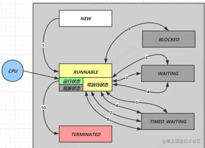 - RUNNABLE 当调用了 start() 方法之后,注意,Java API 层面的 RUNNABLE 状态涵盖了 操作系统 层面的 【可运行状态】、【运行状态】和【阻塞状态】(由于 BIO 导致的线程阻塞,在 Java 里无法区分,仍然认为 是可运行)