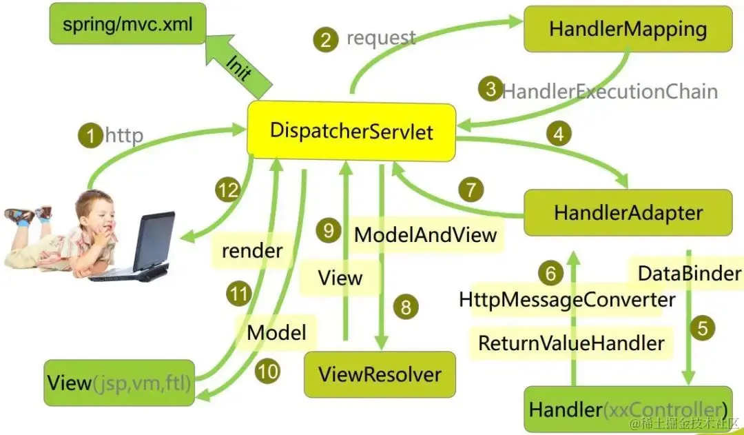 在Spring MVC中,DispatcherServlet 根据请求信息调用 HandlerMapping,解析请求对应的 Handler。解析到对应的 Handler(也就是我们平常说的 Controller 控制器)后,开始由HandlerAdapter 适配器处理。HandlerAdapter 作为期望接口,具体的适配器实现类用于对目标类进行适配,Controller 作为需要适配的类。