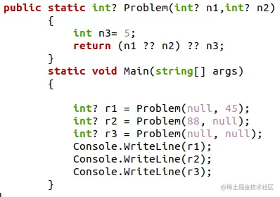 首先,我们将创建一个名为 "问题 "的方法,它需要两个参数。在编写返回语句之前,我们将构造一个变量并给它一个值,这将使用两个空值凝聚运算符对两个参数和变量 "n3 "进行排序。