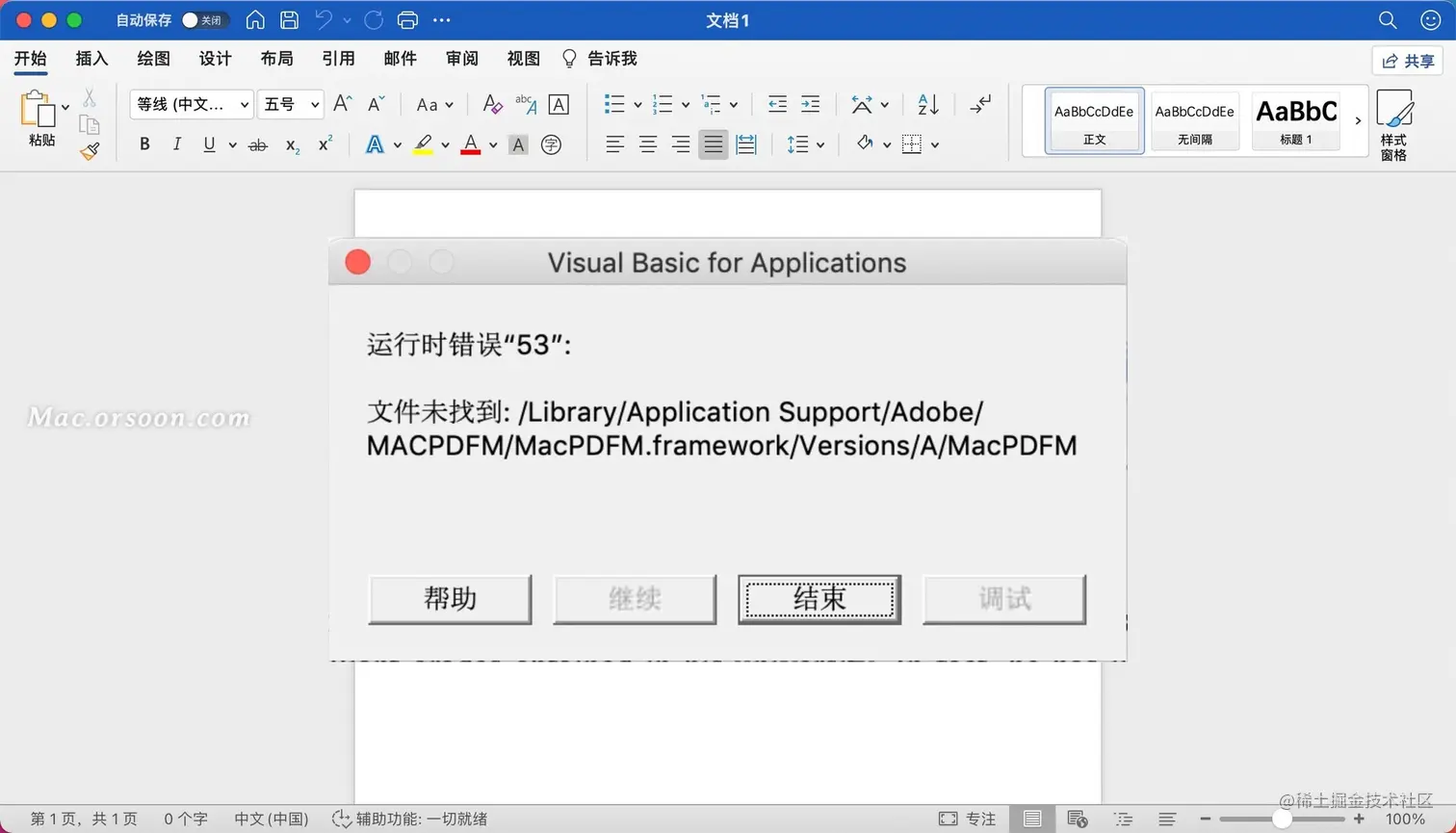 mac电脑在打开Word、PPT 、Excel显示VB运行时错误53,点击结束还会跳出来。多点几次就没了,但是下次新打开一个文档,还会弹出这个窗口。怎么解决这个问题呢?这些问题的出现可能是Windows创建的文档,使用了脚本到Mac上运行时出错了,一起来看看解决方法吧!