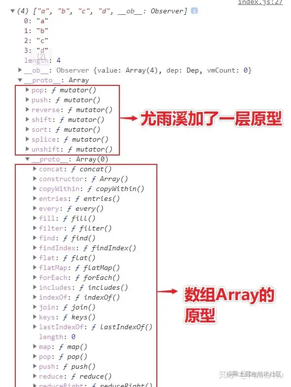 我们发现尤雨溪对着7个API进行了改造,方便你虽数组进行增删,这7个API会自动处理监听和代理,并更新视图。具体内容可以参考文档中的**变异方法章节**。