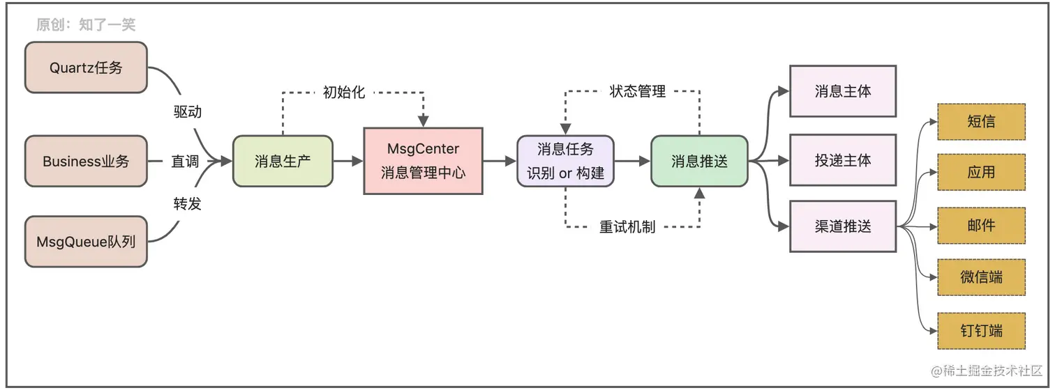 - 消息消费:基于消息任务的结构,构建消息推送的主体内容,并对接多个发送渠道,实现通知的高效触达;