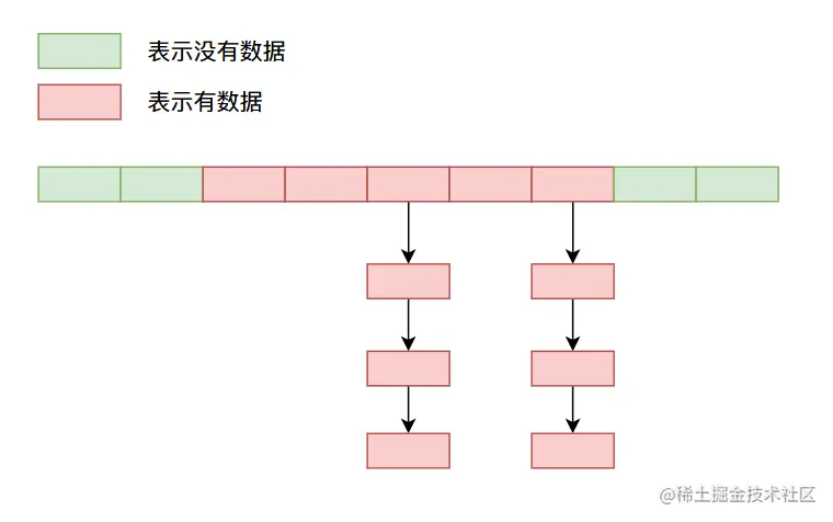 这个方法是目前使用比较多的方法,当产生哈希冲突的时候,数据用一个链表将冲突的数据链接起来,比如像下面这样:
