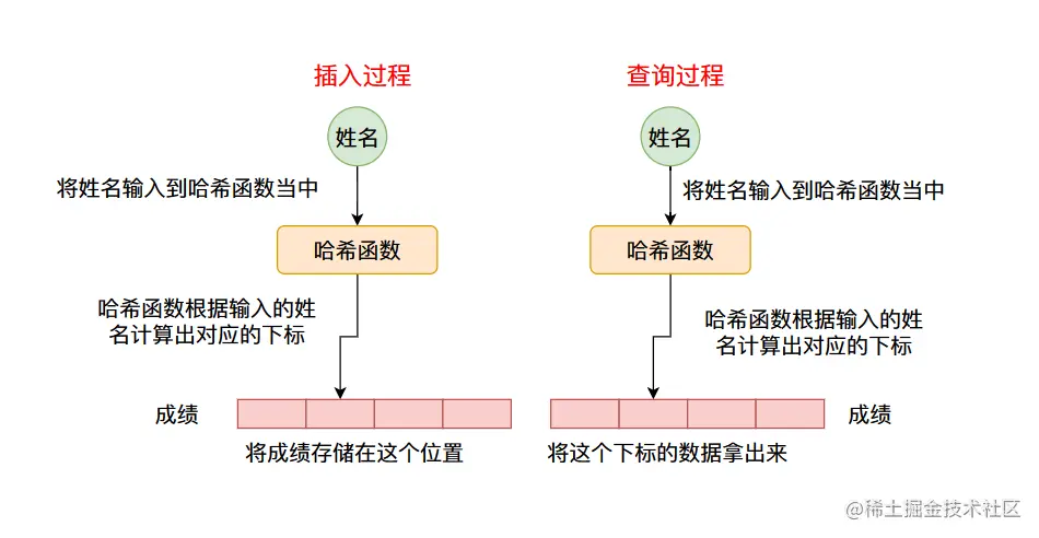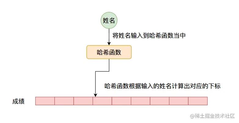 因此我们可以有一个这样的设计,我们可以根据数据的键值计算出一个数字(像这种可以将一个数据转化成一个数字的叫做哈希函数,计算出来的值叫做哈希值我们后续将会仔细说明),将这个哈希值作为数组的下标,这样的话键值和下标就有了对应关系了,我们可以在数组对应的哈希值为下标的位置存储具体的数据,比如上面谈到的成绩,整个流程如下图所示:
