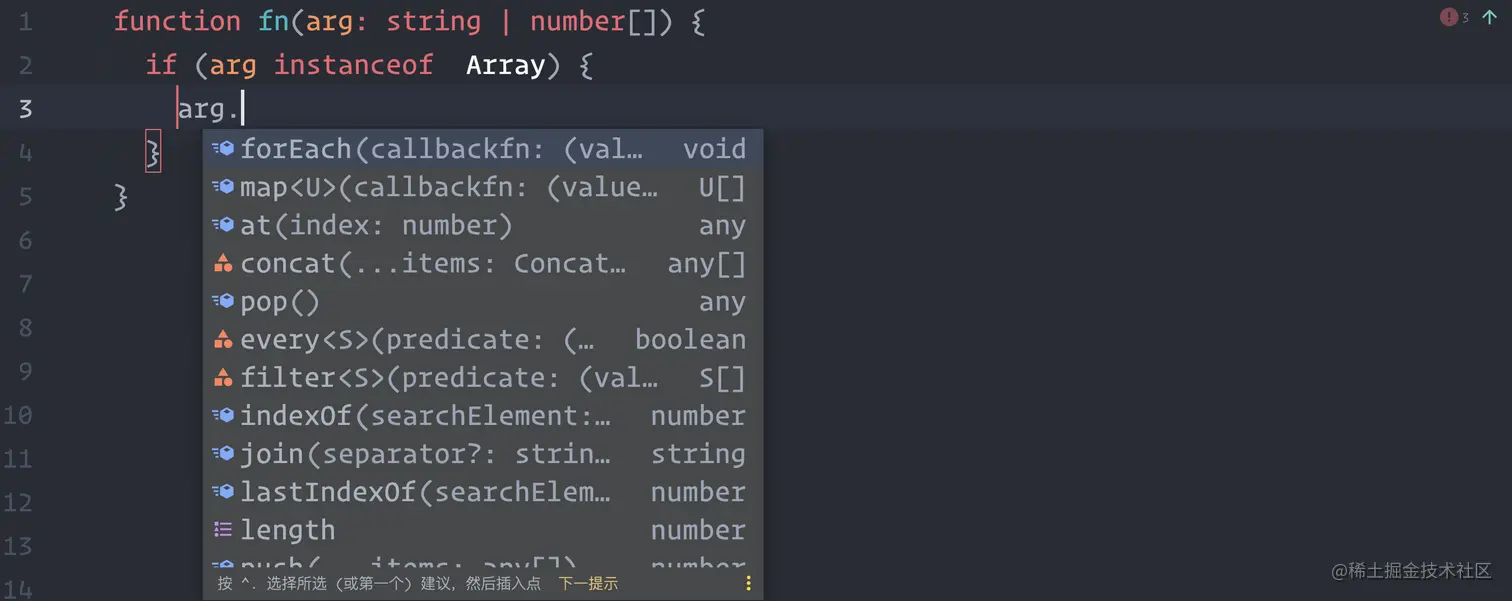 在大多数情况下,在使用联合类型的变量时,需要现缩小变量的类型范围,尽量让ts编译器列出更加准确的属性和方法