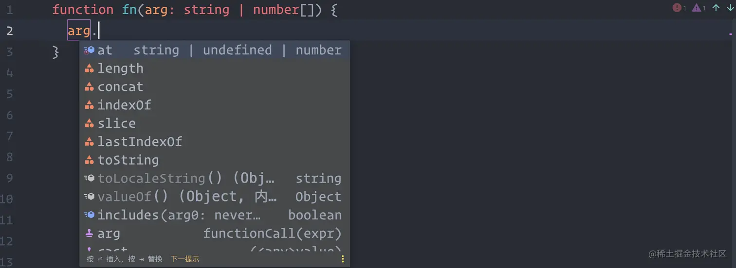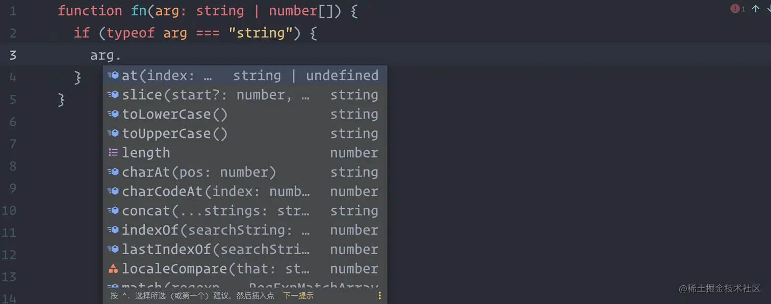 在使用联合类型的变量时,默认只能使用联合类型中所有类型中的公共属性,因为TypeScript 编译器并不能确定它的具体类型是什么,所以不能准确的列出它的下面有哪些属性和方法