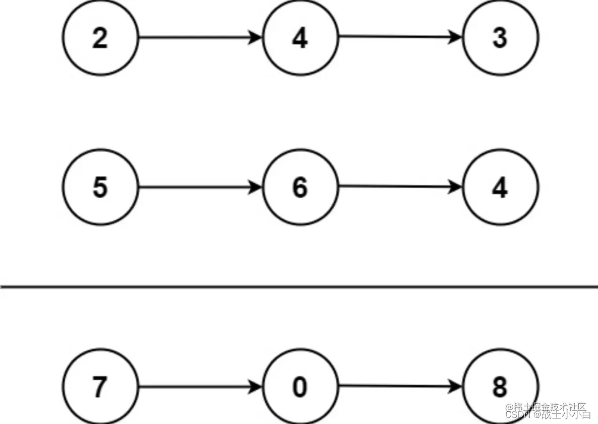 输入:l1 = [2,4,3], l2 = [5,6,4] 输出:[7,0,8] 解释:342 + 465 = 807. 输入:l1 = [0], l2 = [0] 输出:[0] 输入:l1 = [9,9,9,9,9,9,9], l2 = [9,9,9,9] 输出:[8,9,9,9,0,0,0,1]