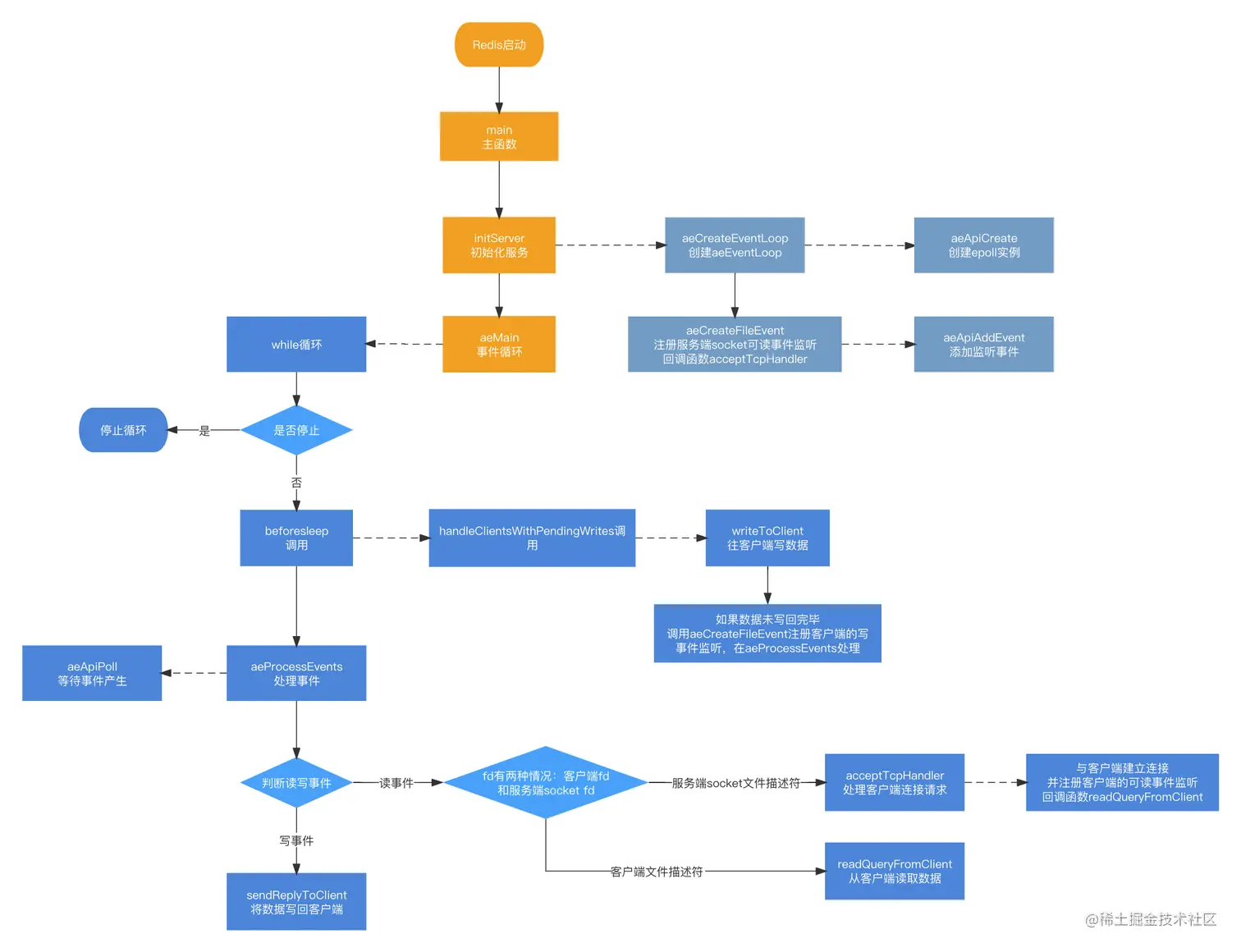 - 调用aeCreateEventLoop函数创建aeEventLoop结构体,对aeEventLoop结构体中的变量进行了初始化,之后调用了aeApiCreate函数创建epoll实例