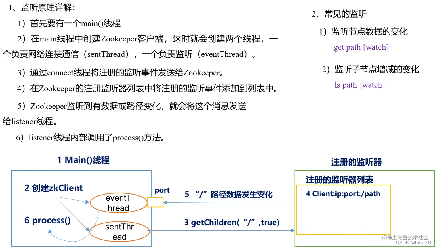 简而言之,若监听A节点,主线程(main)会将请求发送给sent thread,sent thread将请求发送给服务器,执行完,主线程去做自己的事情,直到节点出现变化,服务器将变化信息发送给event thread,event thread再调用回调函数,来通知主线程。
