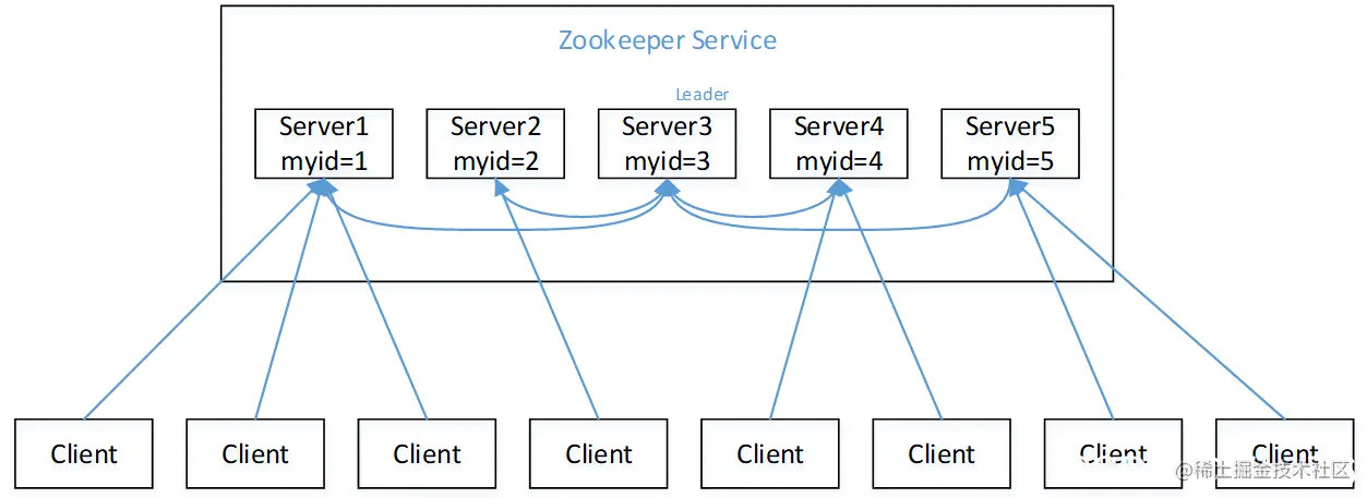 根据以上规则,如果5台同时启动且zxid相同,5号就是leader。正常工作的集群,zxid都相同。