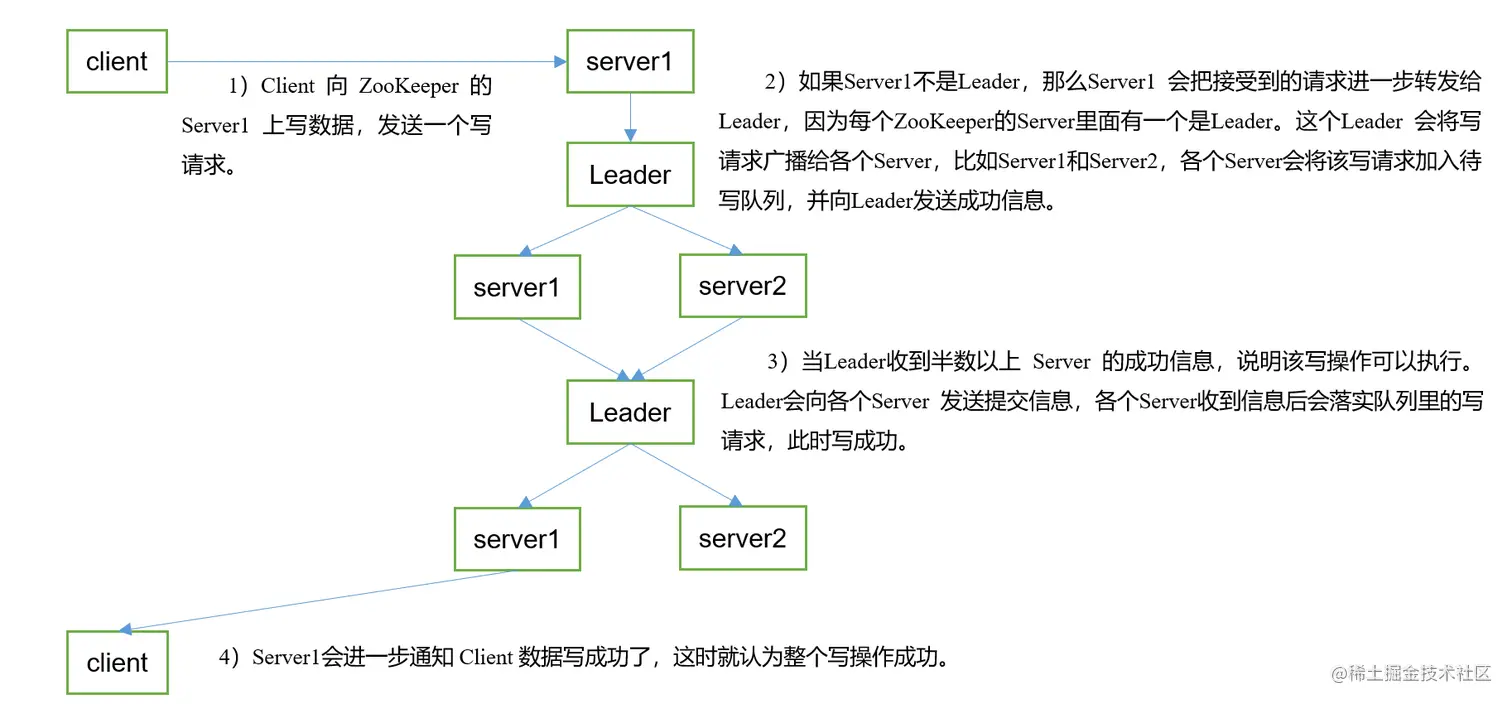 leader发起一次写请求,如果server1同意,server2不同意,leader自己同意,共计两票同意,leader发起写请求,server1,leader完成写操作,写成功之后向client发布广播,但是server不容易写,它就会原地自杀,然后重启,重启之后再向leader同步数据。因为Zookeeper集群要尽最大的可能保持数据的一致性。
