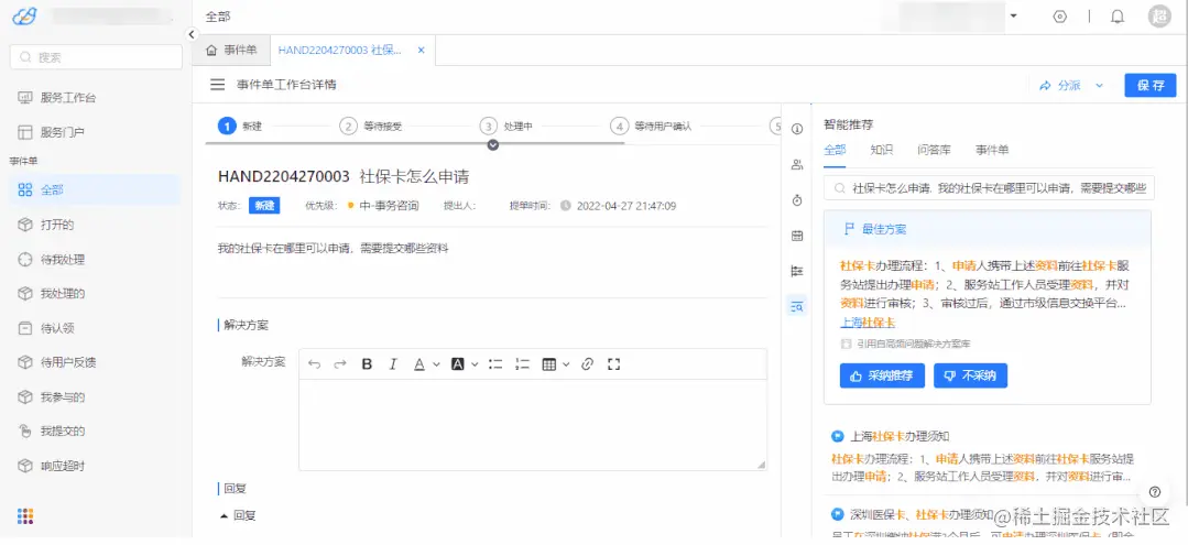 ● 服务提供者可在使用处理工单、人工客服、呼叫中心时体验推荐服务。智能推荐为服务提供者匹配最佳的解决方案,帮助服务提供者快速从知识和历史经验中获得帮助,提高事件处理的效率。