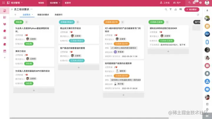 我们设计了一个需求池,所有的员工都可以在这里提交对于培训管理的需求意见,这个设计借鉴了产品管理应用的设计思路。不论是To C端还是To B端的产品,必然是要以终端用户的需求为导向,而不是产品设计者闭门造车就行。所以产品的新功能设计研发之前,都会有用户需求的收集、需求的评审、设计任务的分配、研发资源的排期等过程。