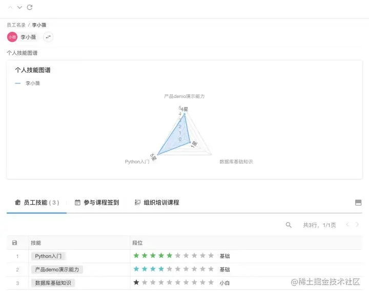 在员工名录下,我们可以直观地看到这个员工当前掌握的技能有哪些,每个技能的精通程度达到了什么段位;金字塔顶尖的大佬们,也许早已把每一个技能点都升到了满级。对于这样的榜样,我们由衷地佩服,却不会因此而气馁,因为我们与榜样的差距不再是不可逾越的天堑,而是有了可以被复制的成长路径。如果暂时做不到满级,就先从点亮一星做起,前方已有指路明灯,纵然道阻且长,我们却走得不迷茫。